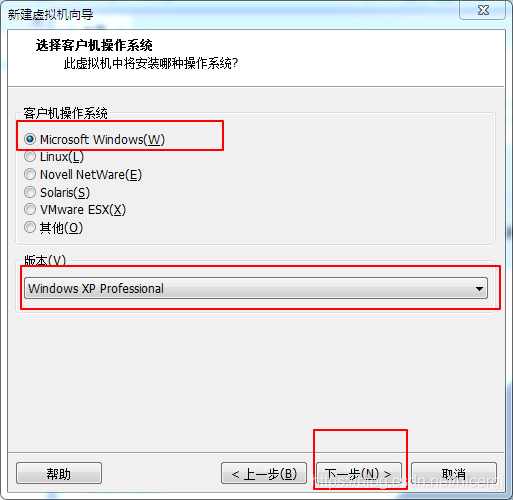 4) 选择Microsoft Windows(W),版本选择Windows XP Professional,点击下一步