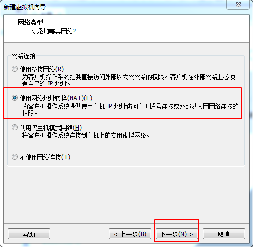 6) 后面是设置处理器和内存的,采用默认的,然后一直点击下一步,直到这里选择网络类型,为了方便使用,选择第二种类型,也可以不上网,选择最后一种类型