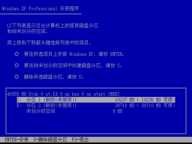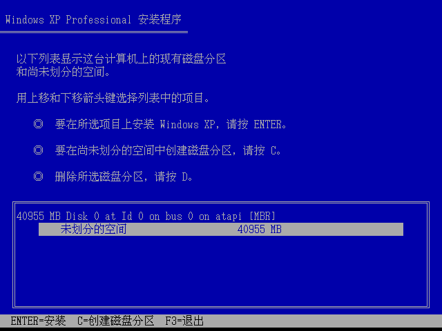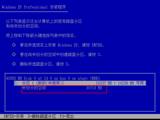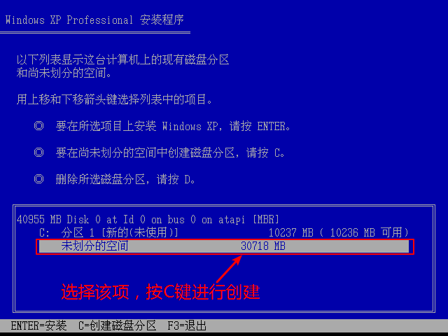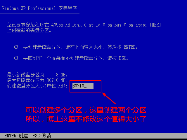 19) 再对“未划分的空间”进行逻辑分区的创建,跟主磁盘分区操作一样,然后按Enter键,按个人喜好可将磁盘分为多个分区