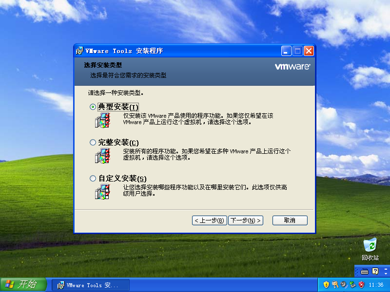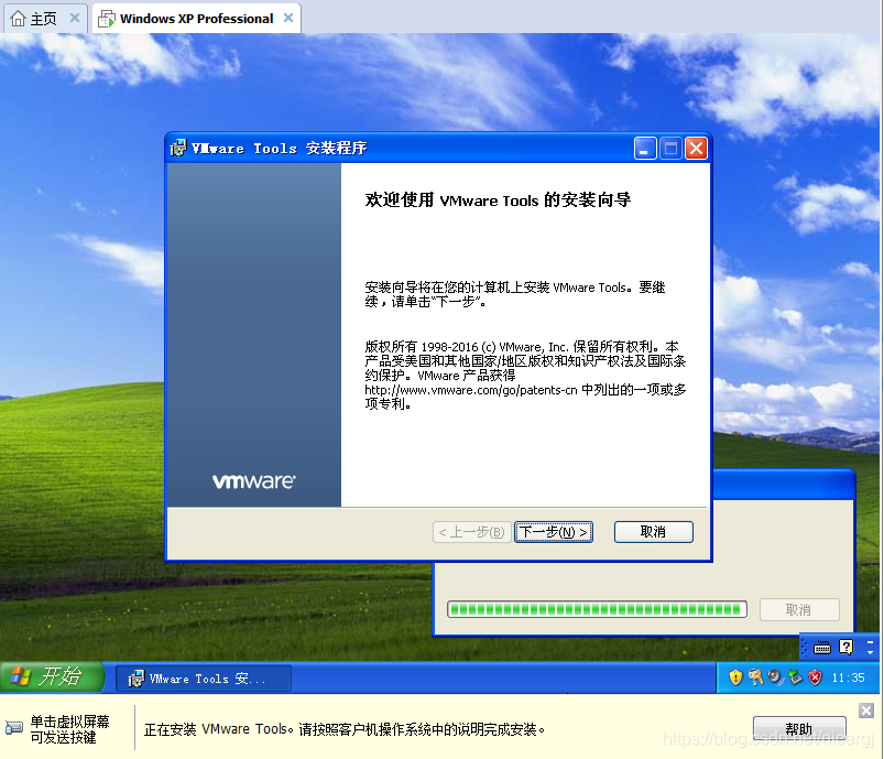 2) 此时在wmware workstation的底部就会弹出一行提示信息,该提示信息指出了如何安装虚拟工具。同时也会弹出虚拟工具的安装向导