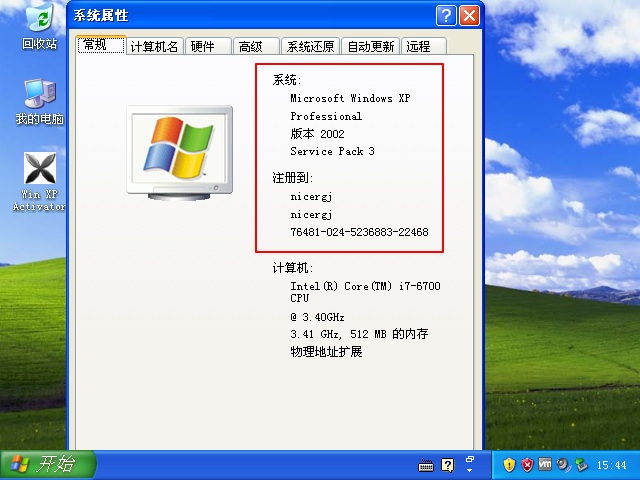 WinXP Activator(XP激活工具)是一个简单有效的Window XP系统激活工具,绿色免安装。下载并压解WinXP Activator(XP激活工具),将其拖放到虚拟机中,双击运行WinXP Activator(XP激活工具)主程序获取xp激活码,程序会提示一串英文字符,大意为本程序将破解你的xp系统,点击“是”即可,几秒的等待后,xp激活码破解工作完成。重新启动操作系统进入系统桌面后鼠标右键“我的电脑”属性,查看系统是否激活,如果能看到已经注册且能看到系统的相关信息,说明激活已经成功。
