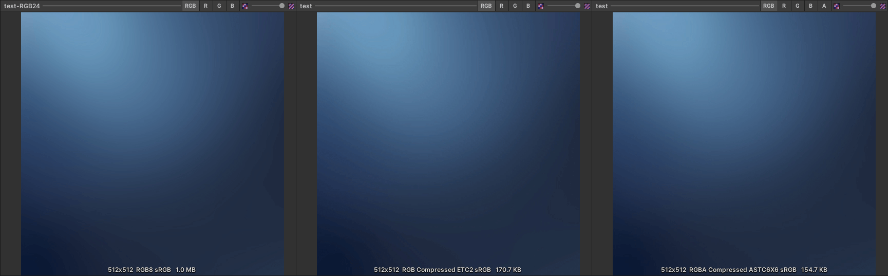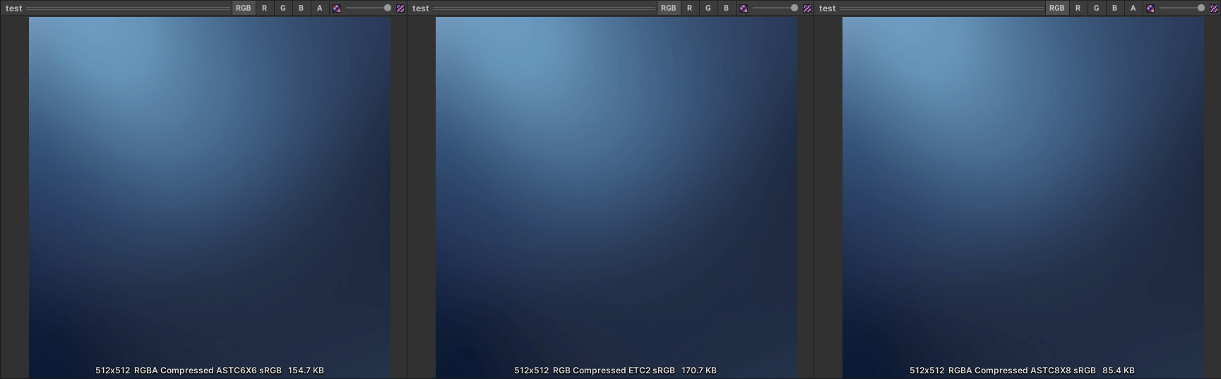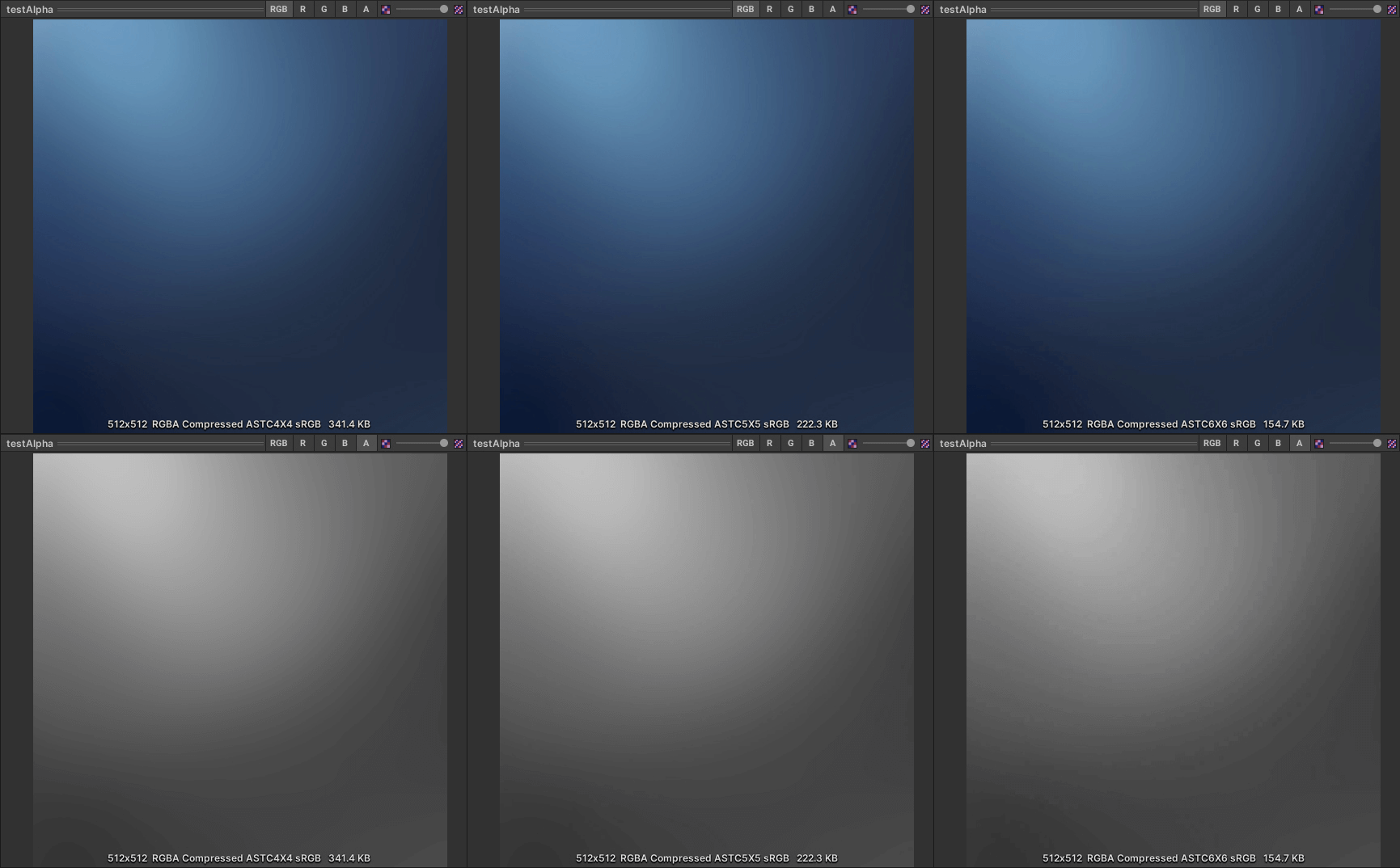从上图可以看出,一张512x512尺寸的贴图(不带Alpha通道,开启Mipmap)的容量为1MB,压缩为ETC2 4 bits后容量为170.7KB,有明显失真,压缩为ASTC 6x6后容量为154.7KB,无明显失真,ASTC 6x6的容量小于ETC2 4 bits,压缩质量高于ETC2 4 bits。