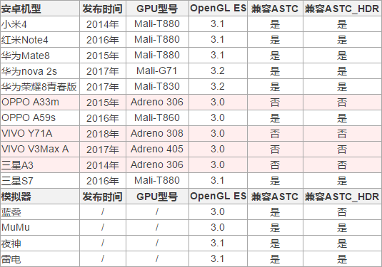 鉴于OpenGL ES 3.0 GPU的不确定性,我们对一些当前用户占比较高的低配机型进行了ASTC格式兼容性测试,并补充了一些占比低的GPU型号Mali-G71、Adreno 306、Adreno 308、Adreno 405做测试(测试时间2020.5.21):