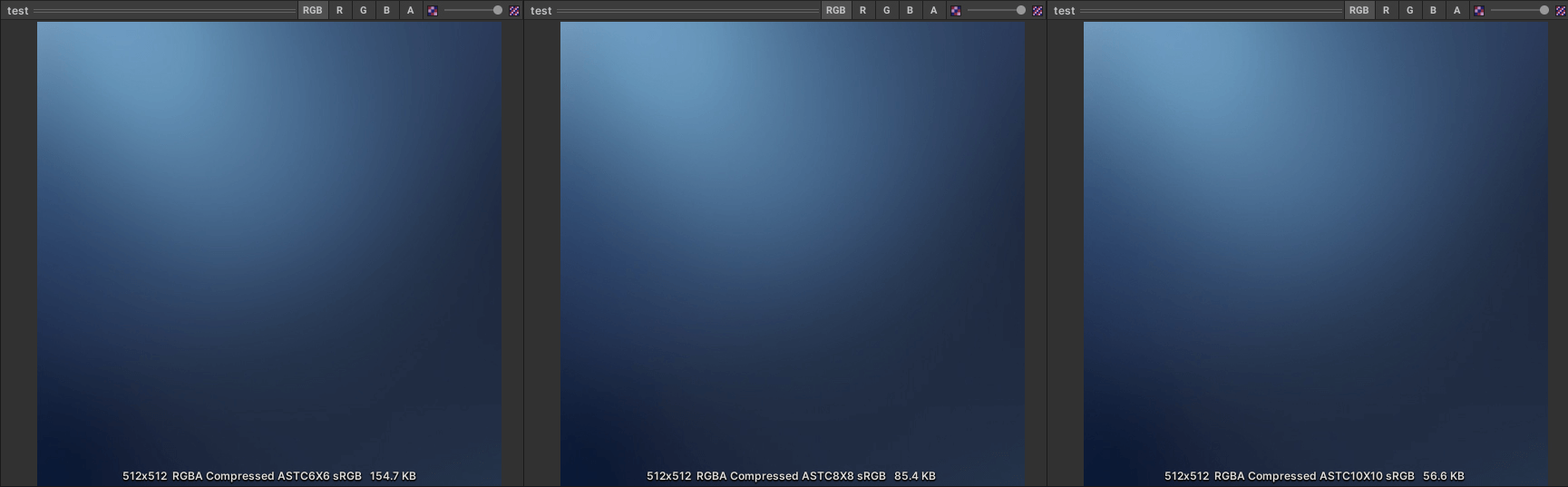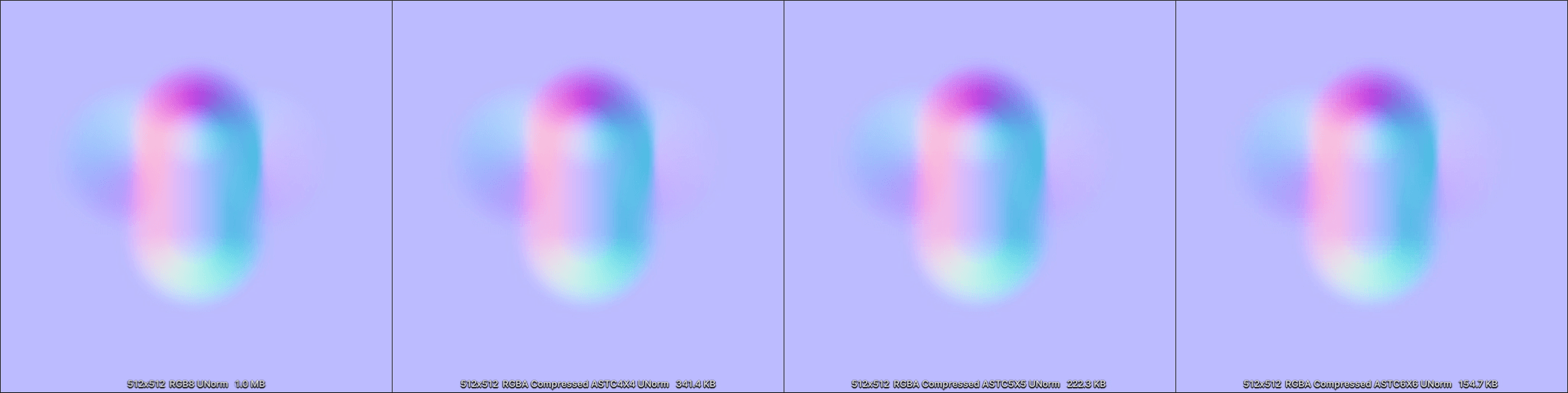 从上图可以看出,一张512x512尺寸的法线贴图,压缩为ASTC 4x4无明显失真,压缩为ASTC 5x5肉眼可见失真,压缩为ASTC 6x6后明显失真。