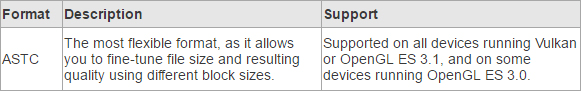 官方文档中提到GPU对ASTC的支持情况:所有支持OpenGL ES 3.1和部分支持OpenGL ES 3.0的GPU。