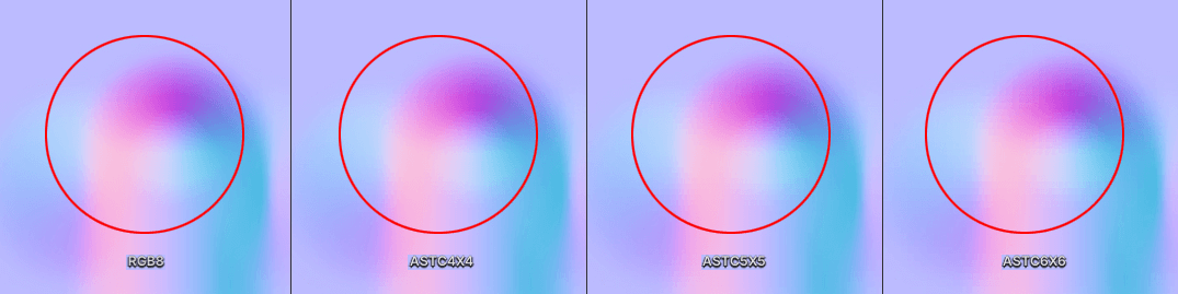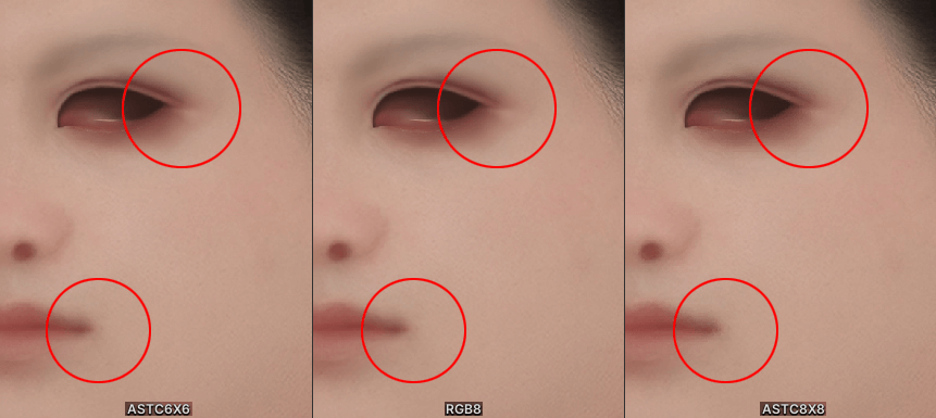 从上图可以看出,压缩为ASTC 6x6无明显失真,压缩为ASTC 8x8后肉眼可见失真。