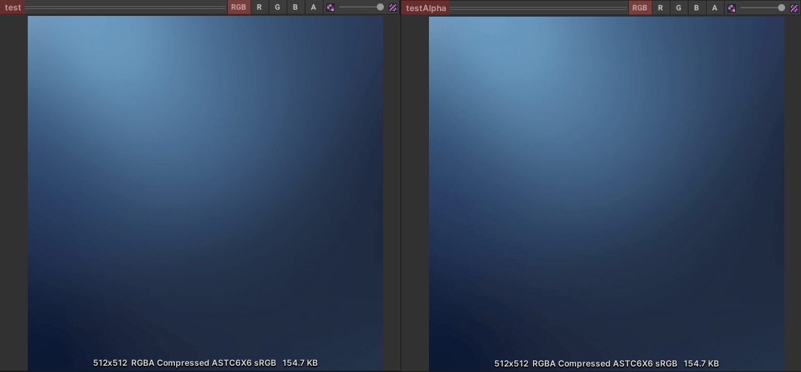 4)无论贴图本身是否带Alpha信息,ASTC压缩的不同设置直接决定压缩大小。控制贴图资源的包体大小,依赖于ASTC压缩格式的规范是否合理,毕竟压缩为ASTC 8x8后容量与ASTC 6x6相比减小了约44.8%(85.4KB vs 154.7KB),压缩为ASTC 8x8后容量与ASTC 4x4相比减小了约300%(85.4KB vs 341.4KB)。而我们通常检查Alpha通道是否为空,可以帮助我们判断Alpha的信息是否冗余,是否应该设置更低的压缩精度。