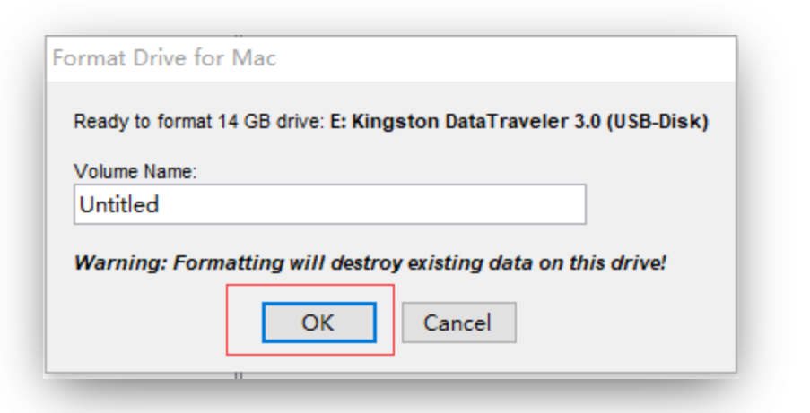 期间弹出警告是否继续操作,点击Yes ,格式化的磁盘名称,默认即可,点击OK。