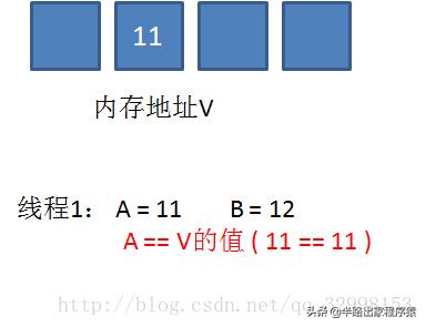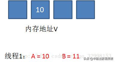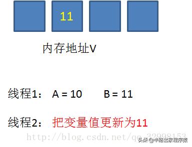 2.此时线程1想把变量的值增加1.对线程1来说,旧的预期值A=10,要修改的新值B=11。