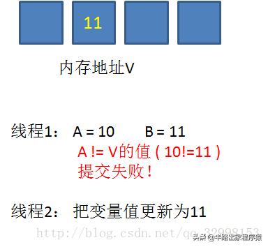 4.线程1开始提交更新,首先进行A和地址V的实际值比较,发现A不等于V的实际值,提交失败。