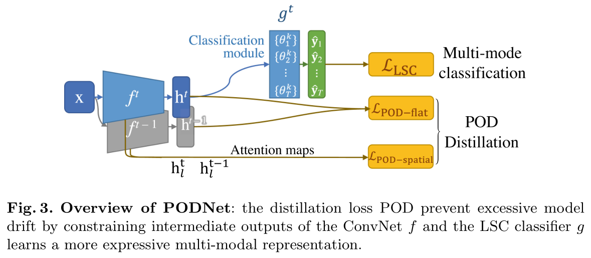 基于样本回放的方法,同时基于知识蒸馏,本文改进了蒸馏的形式,定义了Pooled Output Distillation(POD)