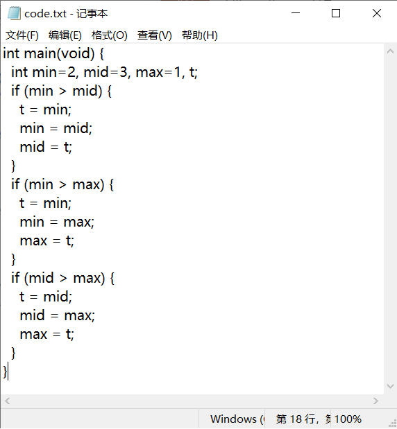 int main(void) {int min=2, mid=3, max=1, t;if (min > mid) {t = min;min = mid;mid = t;}if (min > max) {t = min;min = max;max = t;}if (mid > max) {t = mid;mid = max;max = t;}