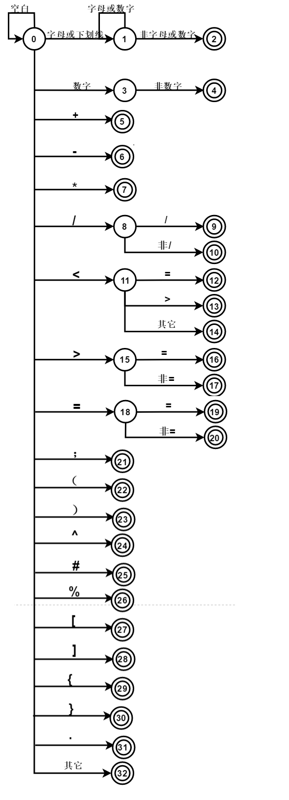 //        }seekresult=fseek(fp,-1,SEEK_CUR);//2:数字 return 2000+Dnum;}//检验界符6 else if(IsJiefu(ch)){int Ji;for(Ji=0;Ji<12;Ji++){if( ch == Jiefu[Ji][0] ){break;} }word+=ch;col++;//6-1+32+i:界符 return (6-1+32+Ji);}//检验关系运算符4 :<=、>=、<>、==、 < 、>else if( IsGuanxiyunsuanfu(ch) ){col++;word+=ch;//检验  <> <=if(ch=='<')   {ch=fgetc(fp);if(ch=='>' || ch=='='){word+=ch;col++; return 4;}}//检验  >= ==else{ch=fgetc(fp);if(ch=='='){word+=ch;col++;return 4;}}if(feof(fp)){flag=0;}seekresult=fseek(fp,-1,SEEK_CUR);//3:算数运算符 return 3;}//首字符是 / 有可能是除号 也有可能是注释else if(ch=='/'){col++;word+=ch;ch=fgetc(fp);//这种情况是除号if(ch!='*' && ch !='/'){seekresult=fseek(fp,-1,SEEK_CUR);//3:算数运算符 return 3;}//注释符//:这一行剩下的全被注释了if(ch=='/'){word.clear();while((ch=fgetc(fp)) && ch!='\n' && !feof(fp) ){}if(feof(fp)){flag=0;return 0;}else{seekresult=fseek(fp,-1,SEEK_CUR);}line++;col=1;return 0;}if(ch=='*'){bool flag5=1;while(flag5){word.clear();ch=fgetc(fp);col++;if(ch=='\n'){line++;col=1;}if(ch!='*')continue;else {ch=fgetc(fp);col++;if(ch=='\n'){line++;col=1;}if(ch=='/'){flag5=0;}else continue;}if(feof(fp)){flag=0;return 0;}}}}else {word+=ch;col++;return -1;}
