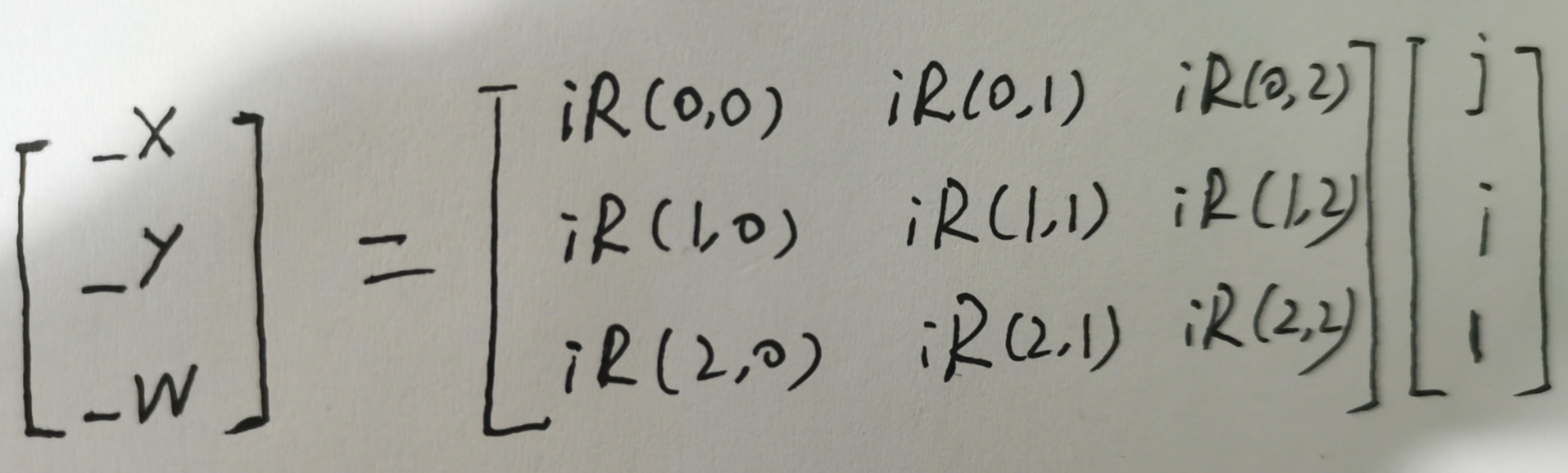 ************************************************************************************************/for( int i = 0; i < size.height; ++i){float* m1f = map1.getMat().ptr<float>(i);float* m2f = map2.getMat().ptr<float>(i);short* m1 = (short*)m1f; //令m1为指向map1每个元素的指针,初始m1为&map1(0,0)[0],加1后为&map1(0,0)[1],再加1后为&map1(0,1)[0],再加1后为&map1(0,1)[1]……ushort* m2 = (ushort*)m2f; //令m2为指向map2每个元素的指针,map2为一维矩阵//计算相机坐标系下的坐标double _x = i*iR(0, 1) + iR(0, 2),_y = i*iR(1, 1) + iR(1, 2),_w = i*iR(2, 1) + iR(2, 2);for( int j = 0; j < size.width; ++j){//(i, j)是无畸变图上的像素点坐标