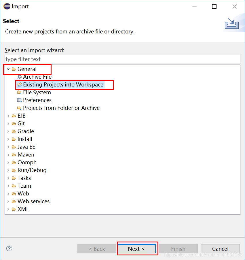 2,在跳出对话框中,general-->Existing Projects into Workspace次序击点,之后击点next按钮