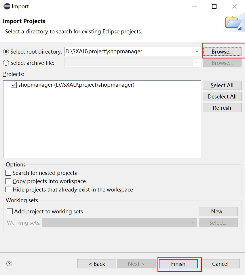 3,在新对话框中,击点[Browse]按钮,选择项目所在目录,,选择完成后,击点[finish]按钮