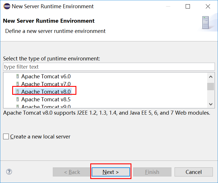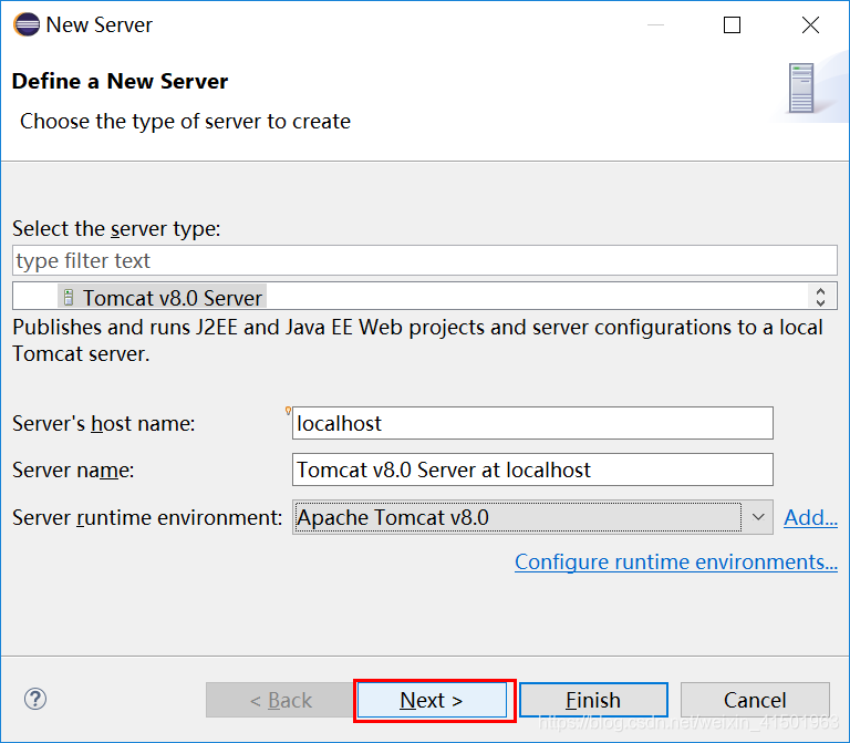 (3)在新跳出来的对话框中,选择apache tomcat8,击点next按钮