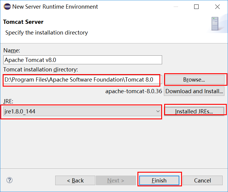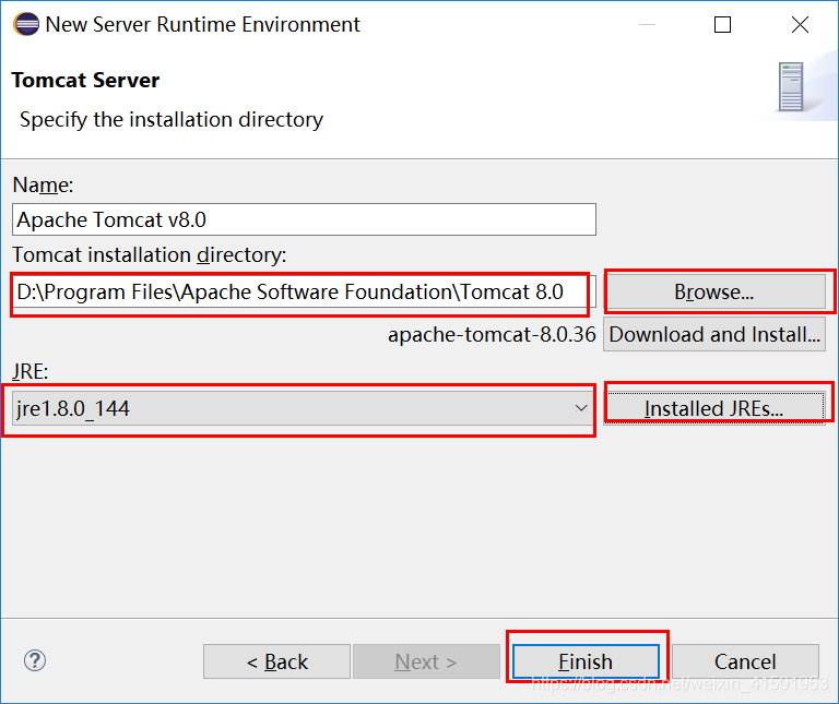 (4)击点browse按钮,选择tomcat安装目录,JRE中选择Java JDK安装目录,这里可以击点Installed JREs按钮,确认JRE目录需要定义在JDK目录下不能是JRE目录,最后击点finish按钮结束。关闭对话框。
