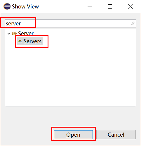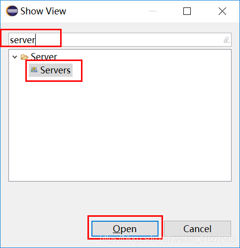 (6)跳出对话框中,输入框中输入server,可以看到下面选择树中出现server选项,双击或点中后,击点open按钮