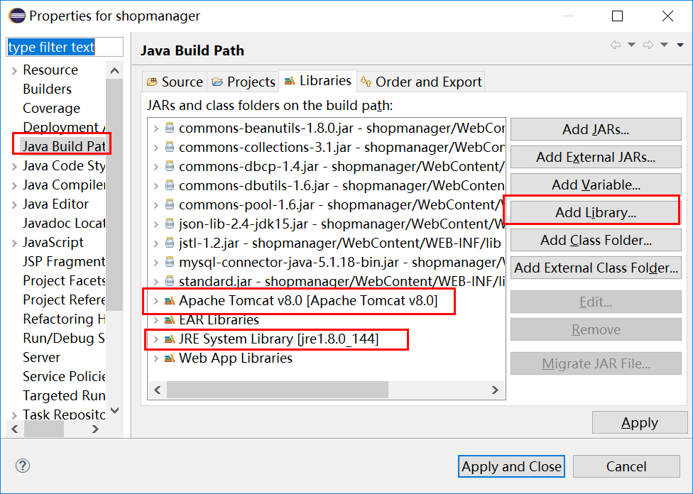 (1)确认左边项目名左边是否有红叉,如果有,则为项目JDK和tomcat配置问题,鼠标移到项目名上,鼠标右键,弹出菜单选择最下面properties,就会出现项目对话框,对话框左边选择Java Build Path,右边查看JDK和tomcat配置是否有问题。