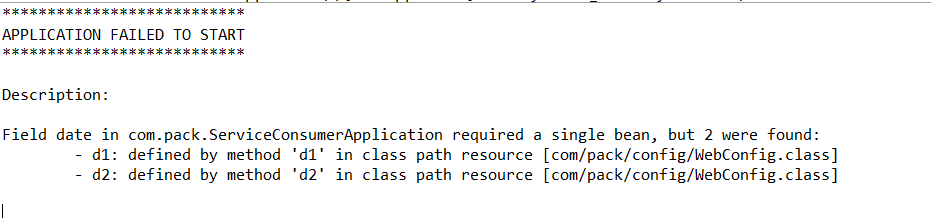 Caused by: org.springframework.beans.factory.NoUniqueBeanDefinitionException: No qualifying bean of type 'java.util.Date' available: expected single matching bean but found 2: d1,d2