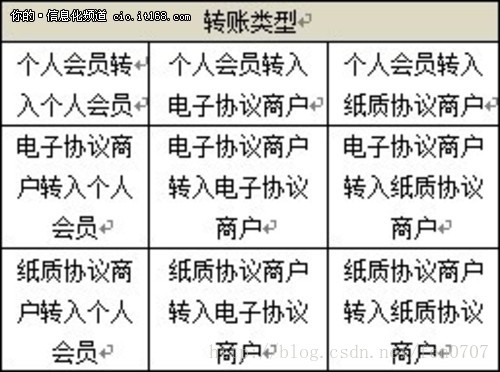 常规情况下,支付系统为客户提供正常转账流程,但本系统对客户进行了细分,包括个人会员、电子协议商户、纸质协议商户,对不同类型的客户间转账设置了不同的处理规则,如表1所示。