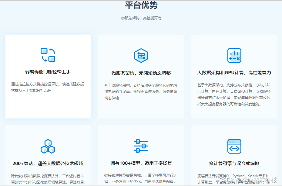 平台可进行可视化、一站式、高性能的数据挖掘与人工智能建模服务。包括:多行业项目模型库,多类型数据介入支持,海量数据挖掘算法,自定义个人算法,定时出发模型任务,模型API灵活调用