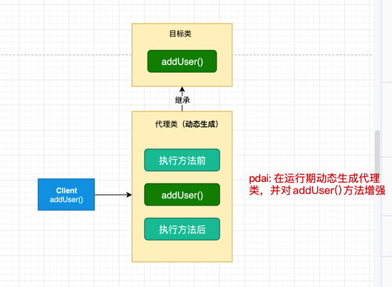 在生成代理对象的过程中,目标对象不变,代理对象中的方法是目标对象方法的增强方法。可以理解为运行期间,对象中方法的动态拦截,在拦截方法的前后执行功能操作。