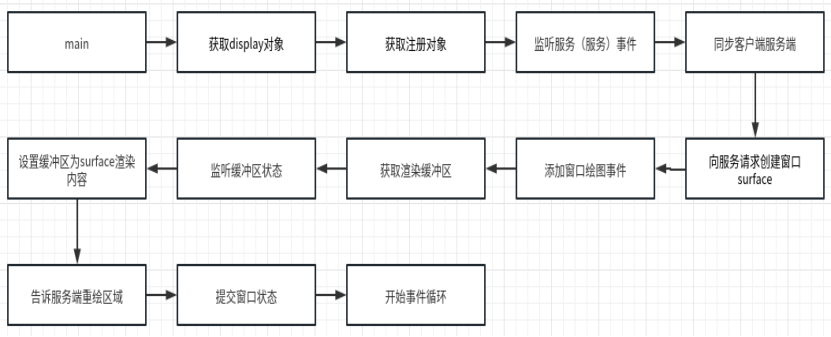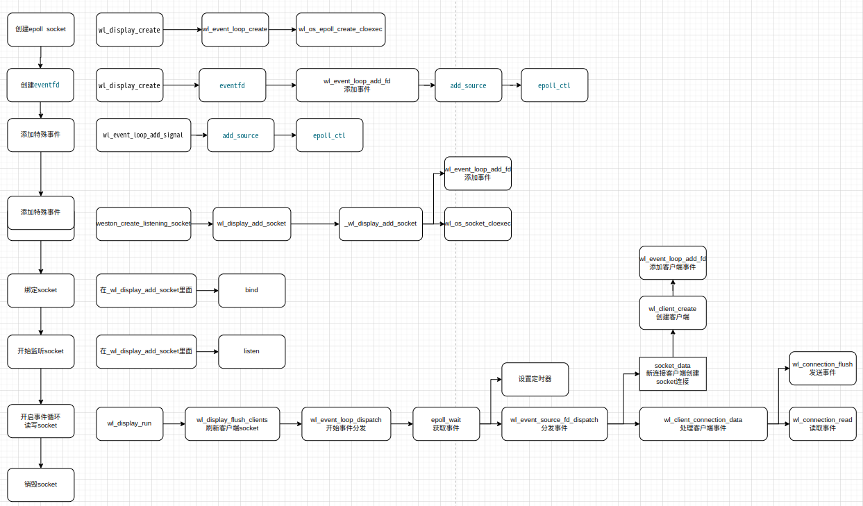 创建监听socket(默认/run/user/1000/wayland-0),监听客户与服务端连接