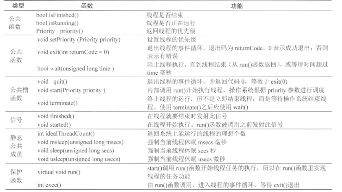 QThread类提供不依赖于平台的管理线程的方法。一个QThread类的对象管理一个线程,一 般从QThread继承一个自定义类,并重定义虚函数run(),在run()函数里实现线程需要完成的任务。
