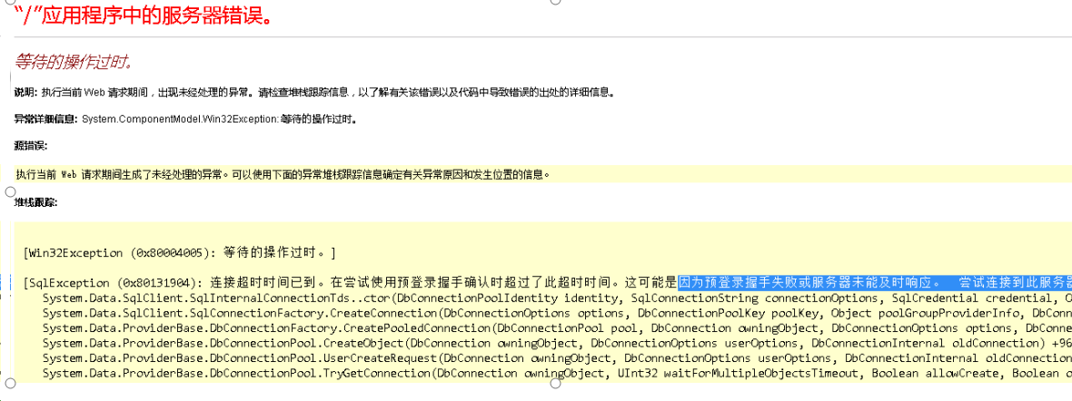 System.Data.SqlClient.SqlException: 连接超时时间已到。在尝试使用预登录握手确认时超过了此超时时间。这可能是因为预登录握手失败或服务器未能及时响应。 尝试连接到此服务器时花费的持续时间是 - [Pre-Login] initialization=8;handshake=14992; ---> System.ComponentModel.Win32Exception: 等待的操作过时。