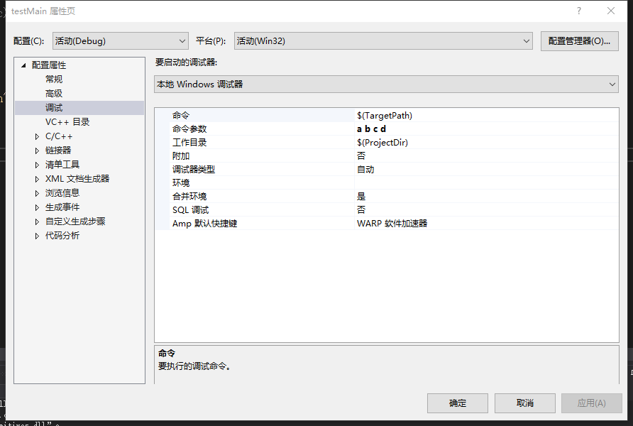 在VS中,项目->属性->调试->命令参数 也可以设置命令参数