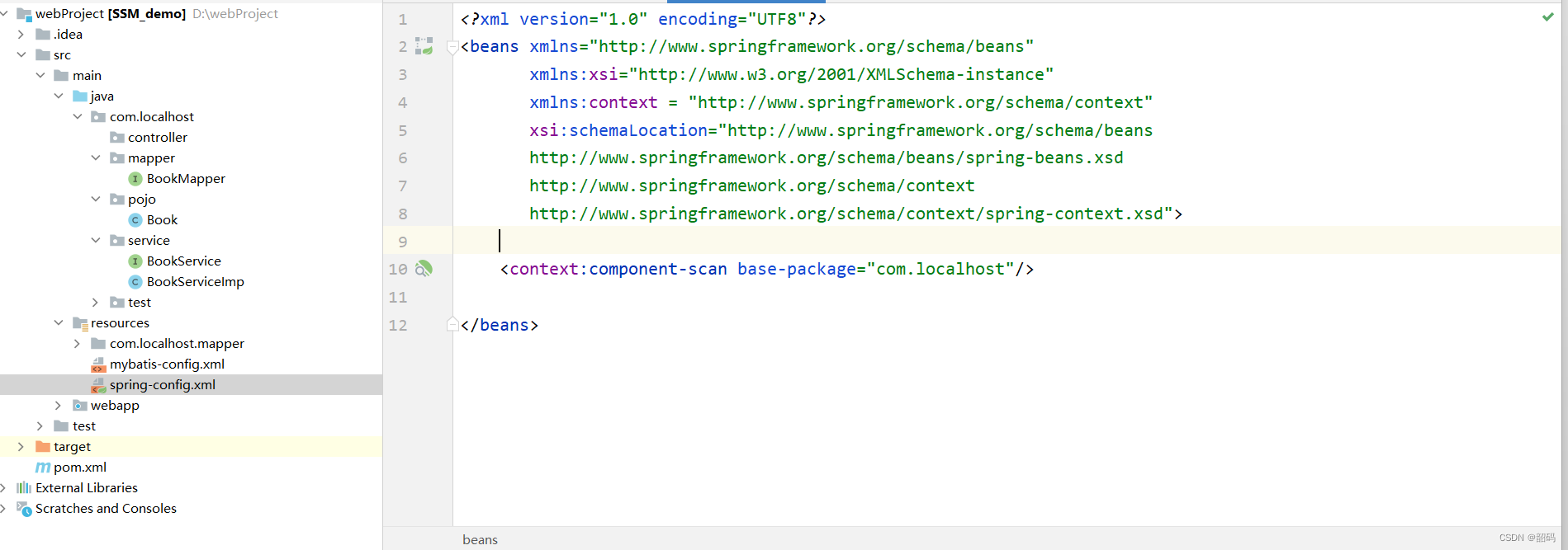 <beans xmlns="http://www.springframework.org/schema/beans"xmlns:xsi="http://www.w3.org/2001/XMLSchema-instance"xmlns:context = "http://www.springframework.org/schema/context"xsi:schemaLocation="http://www.springframework.org/schema/beanshttp://www.springframework.org/schema/beans/spring-beans.xsdhttp://www.springframework.org/schema/contexthttp://www.springframework.org/schema/context/spring-context.xsd"><context:component-scan base-package="com.localhost"/><!-- 设置数据源头--><bean id="dataSource" class="com.mchange.v2.c3p0.ComboPooledDataSource"><property name="driverClass" value="com.mysql.jdbc.Driver"/><property name="jdbcUrl" value="jdbc:mysql://localhost:3306/bookStore"/><property name="user" value="root"/><property name="password" value="pass123"/></bean><!-- 声明事物--><bean id="dataSourceTransactionManager" class="org.springframework.jdbc.datasource.DataSourceTransactionManager"><property name="dataSource" ref="dataSource"/></bean><!-- 以下部分用来整合spring和mybatis,这样service才能注入dao对象--><!-- 声明mybatis的扫描器,创建dao对象--><bean class="org.mybatis.spring.mapper.MapperScannerConfigurer"><property name="sqlSessionFactoryBeanName" value="sqlSessionFactory"/><property name="basePackage" value="com.localhost.mapper"/></bean><!--声明SqlSessionFactoryBean 创建sqlSessionFactory--><bean id="sqlSessionFactory" class="org.mybatis.spring.SqlSessionFactoryBean"><property name="dataSource" ref="dataSource"/>