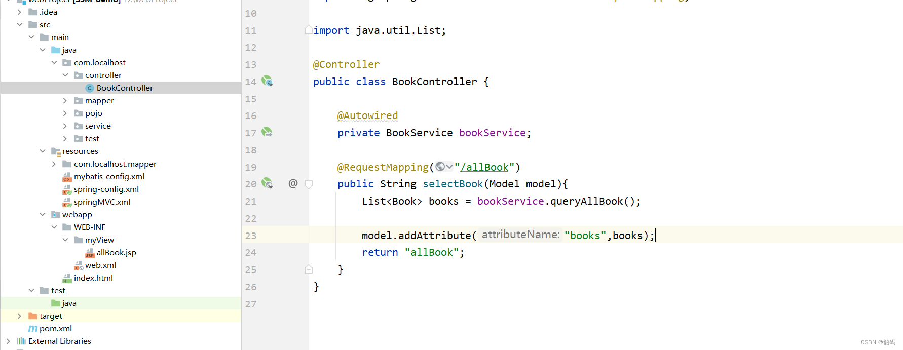 import com.localhost.pojo.Book;import java.util.List;public class BookServiceImp implements BookService {BookMapper bookMapper;@Overridepublic List<Book> queryAllBook() {return bookMapper.queryAllBook();}