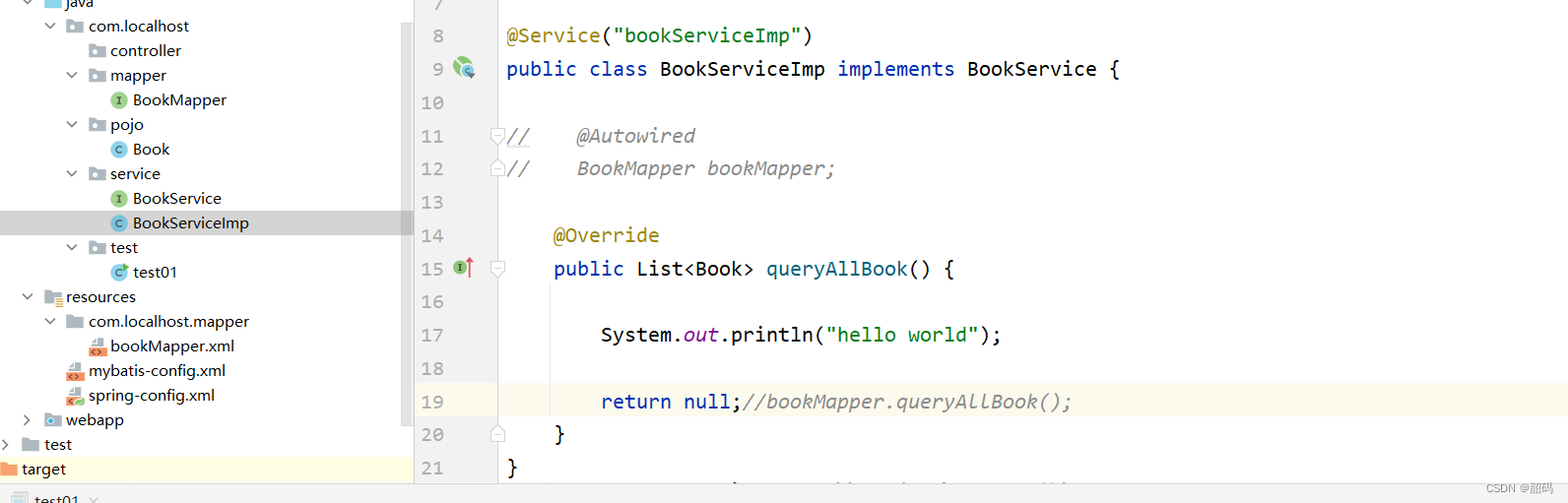 图中注释掉bookMapper是因为spring和mybatis还没有整合,bookMapper对象还没有正常创建