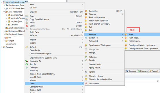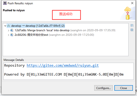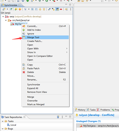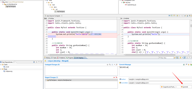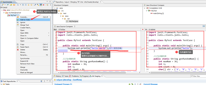 4.功能完成后可直接合并本地的 develop 分支后 push 到远程仓库,合并的时候很大几率发生冲突,此时需要 merge ,merge的时候确保不影响项目其他成员,如果多个人都操作了同一个类,最好当面确认后在进行修改。等合并完成确认无误后,删除本地分支