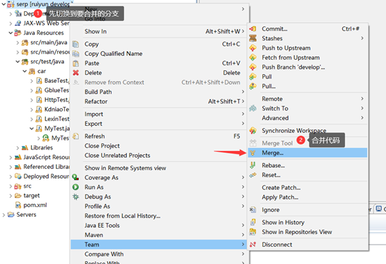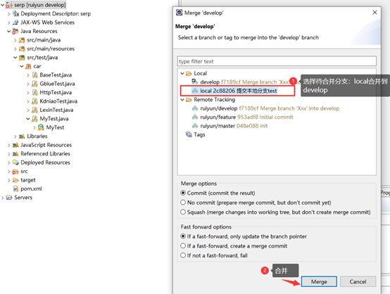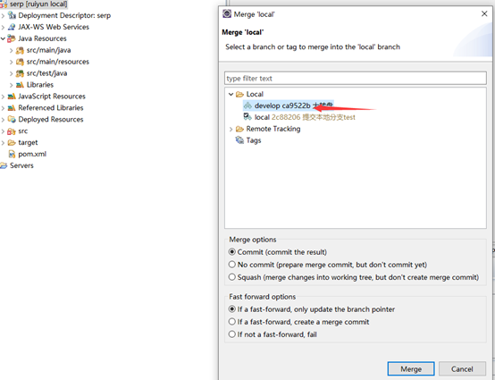 当前切换到哪个分支就是要合并的目标分支,然后选中merge
