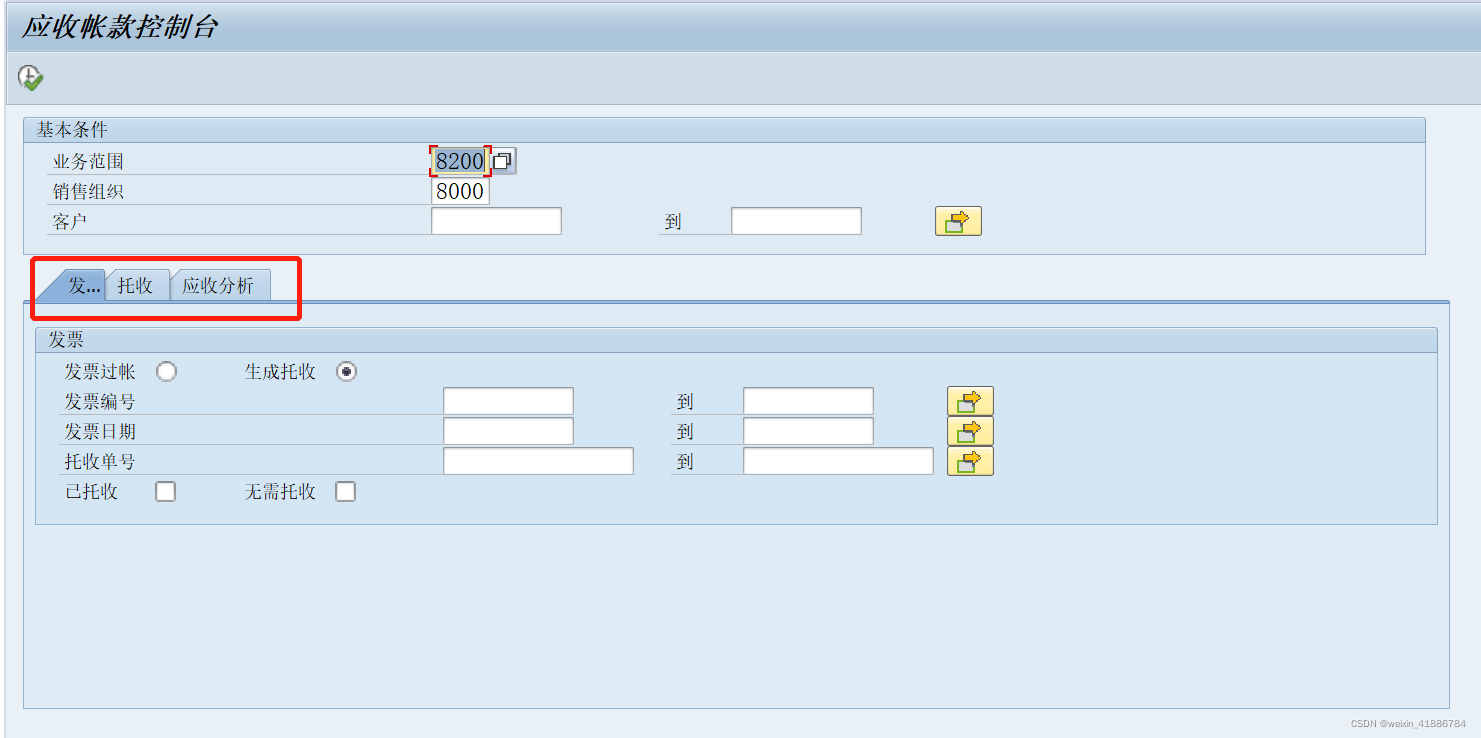 SELECT-OPTIONS:S_VBELN FOR VBRK-VBELN MODIF ID MTS,"发票号S_FKDAT FOR VBRK-FKDAT MODIF ID MTS,"发票日期S_FBELNR FOR ZTMM_ZTSCL-BELNR MODIF ID MTS."托收单号