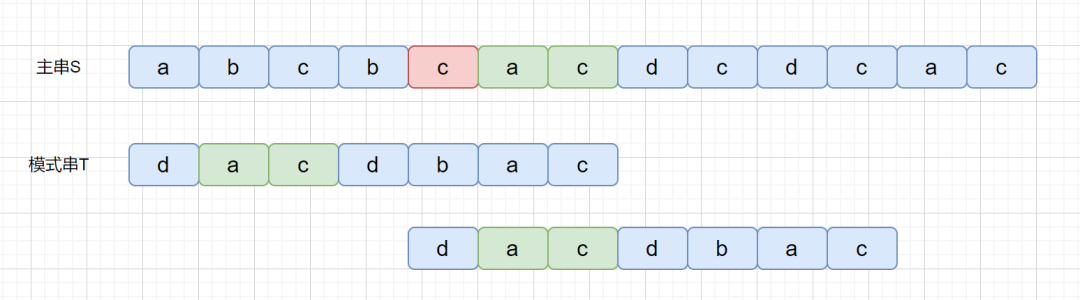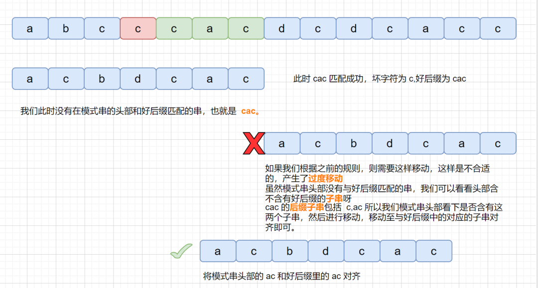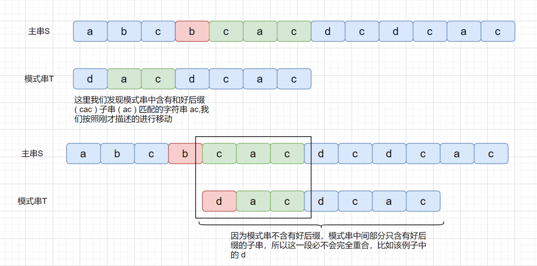 BM 算法是从右往左进行比较,发现坏字符的时候此时 cac 已经匹配成功,在红色阴影处发现坏字符。此时已经匹配成功的 cac 则为我们的好后缀,此时我们拿它在模式串中查找,如果找到了另一个和好后缀相匹配的串,那我们就将另一个和好后缀相匹配的串 ,滑到和好后缀对齐的位置。