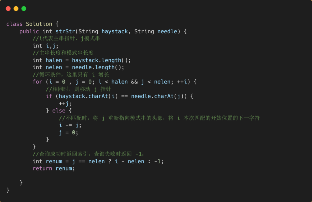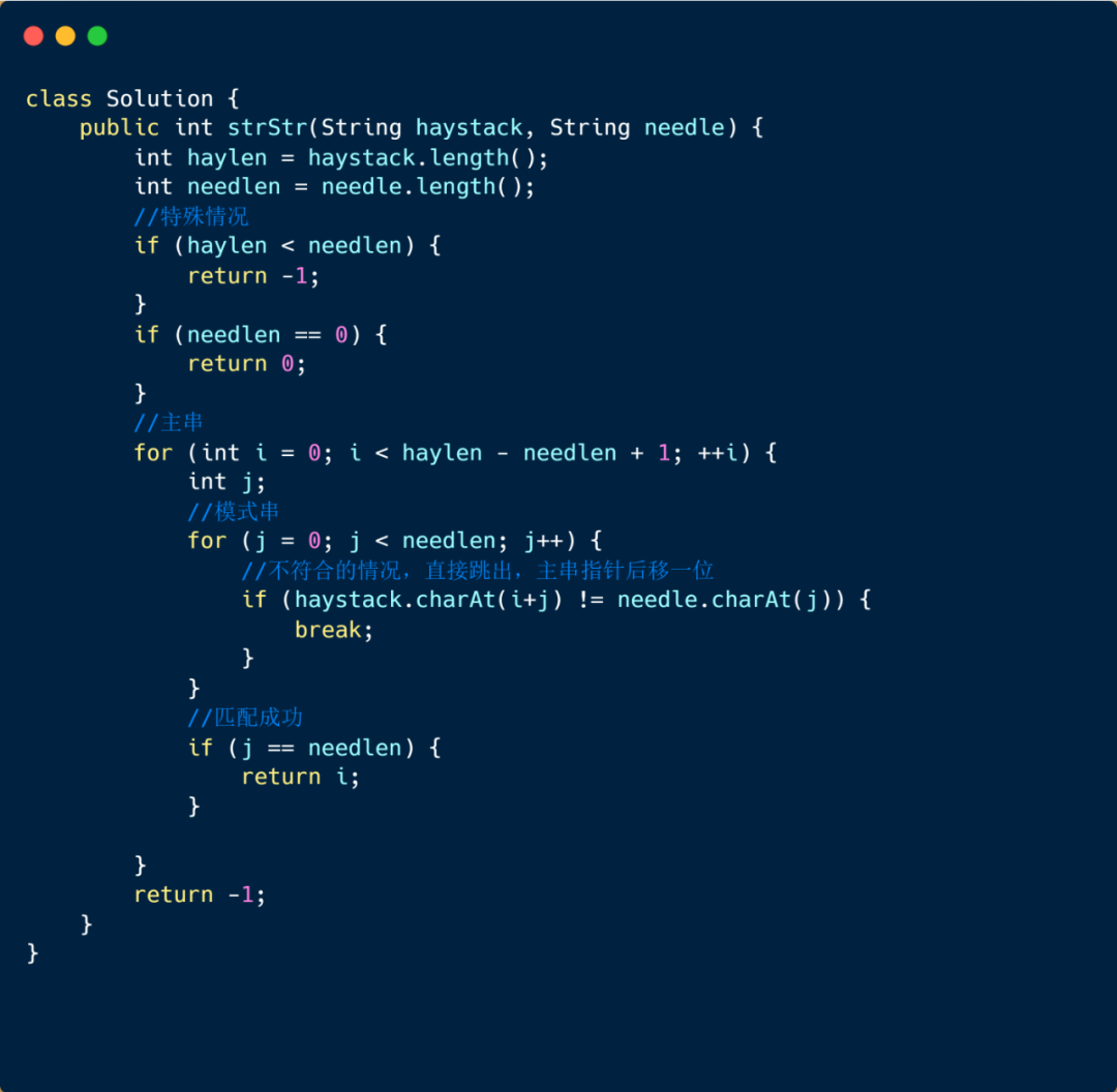 其实这个题目很容易理解,但是我们需要注意的是一下几点,比如我们的模式串为 0 时,应该返回什么,我们的模式串长度大于主串长度时,应该返回什么,也是我们需要注意的地方。下面我们来看一下题目代码吧。