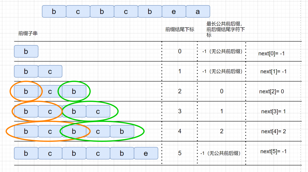 next 数组存的咱们最长公共前后缀中,前缀的结尾字符下标。是不是感觉有点别扭,我们通过一个例子进行说明。
