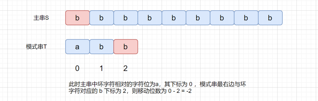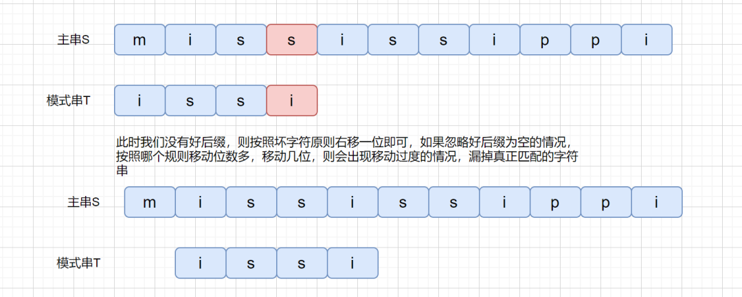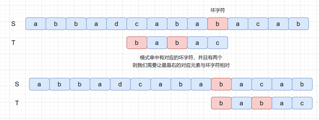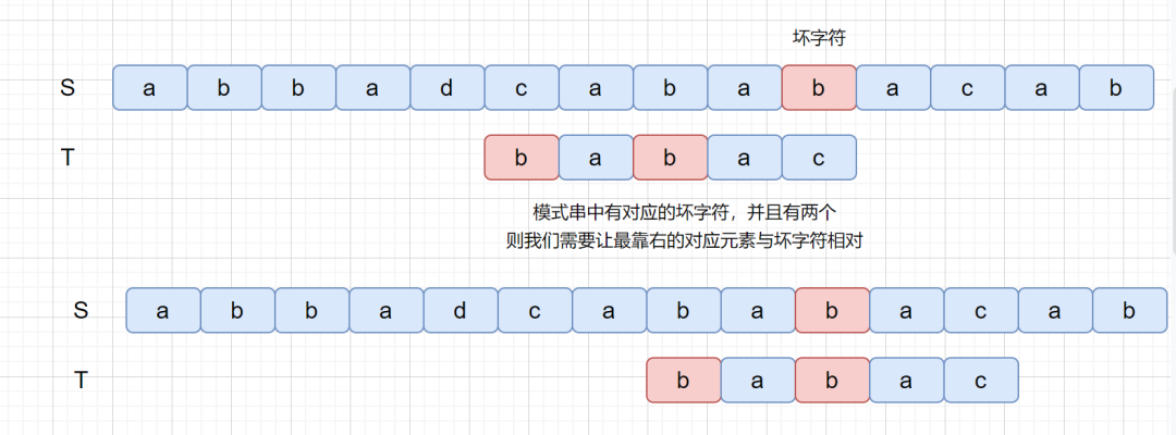 那么我们为什么要让最靠右的对应元素与坏字符匹配呢?如果上面的例子我们没有按照这条规则看下会产生什么问题。