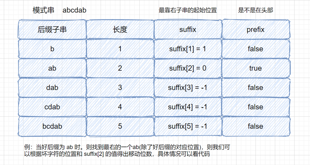 说到这里,坏字符和好后缀规则就算说完了,坏字符很容易理解,我们对好后缀总结一下
