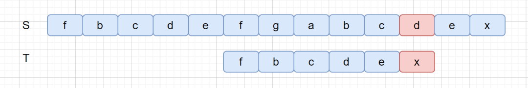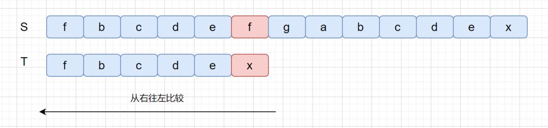 BM 算法是从后往前进行比较,此时我们发现比较的第一个字符就不匹配,我们将主串这个字符称之为坏字符,也就是 f ,我们发现坏字符之后,模式串 T 中查找是否含有该字符 f,我们发现并不存在 f,此时我们只需将模式串右移到坏字符的后面一位即可。如下图