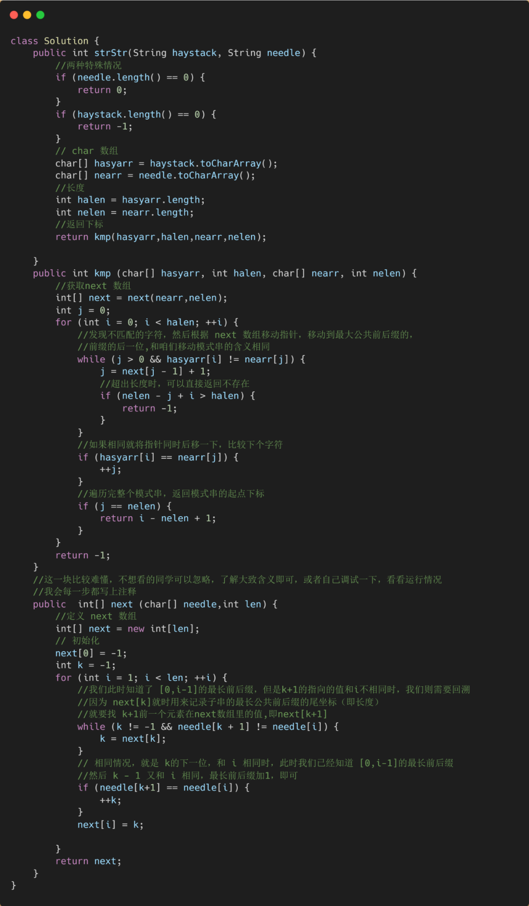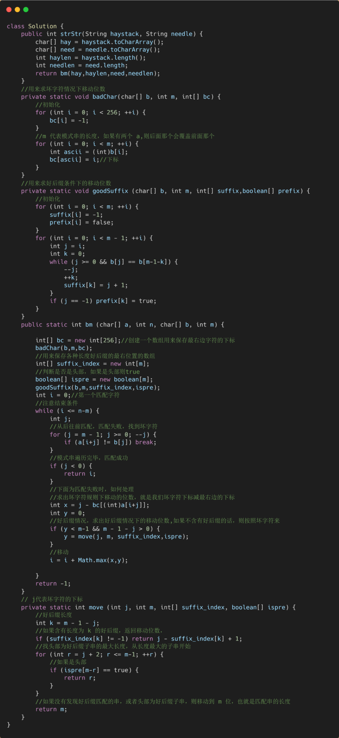 这破图画起来是真费劲啊。下面我们来看一下算法代码,代码有点长,我都标上了注释也在网站上 AC 了,如果各位感兴趣可以看一下,不感兴趣的话,理解坏字符和好后缀规则即可。可以直接跳到 KMP 部分