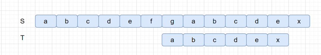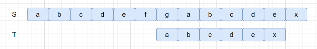 如上图所示,如果我们利用 BF 算法,遇到不匹配字符时,每次右移一位模式串,再重新从头进行匹配,我们观察一下,我们的模式串 abcdex 中每个字符都不一样,但是我们第一次进行字符串匹配时,abcde 都匹配成功,到 x 时失败,又因为模式串每位都不相同,所以我们不需要再每次右移一位,再重新比较,我们可以直接跳过某些步骤。如下图