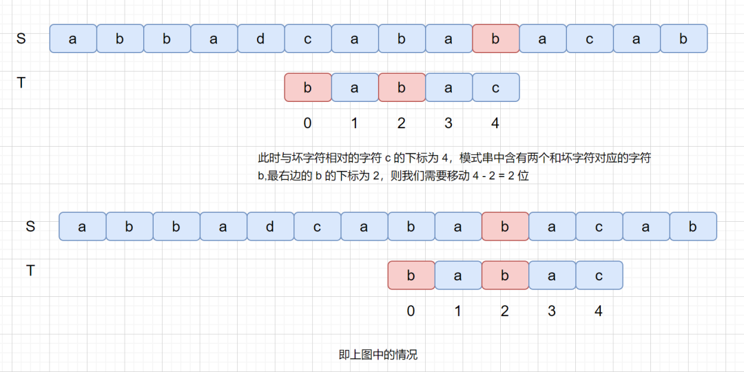 3.如果在模式串尾部就出现不匹配的情况,即不存在好后缀时,则根据坏字符进行移动,这里有挺多文章没有提到,是个需要特别注意的地方,我是在这个论文里找到答案的,感兴趣的同学可以看下。