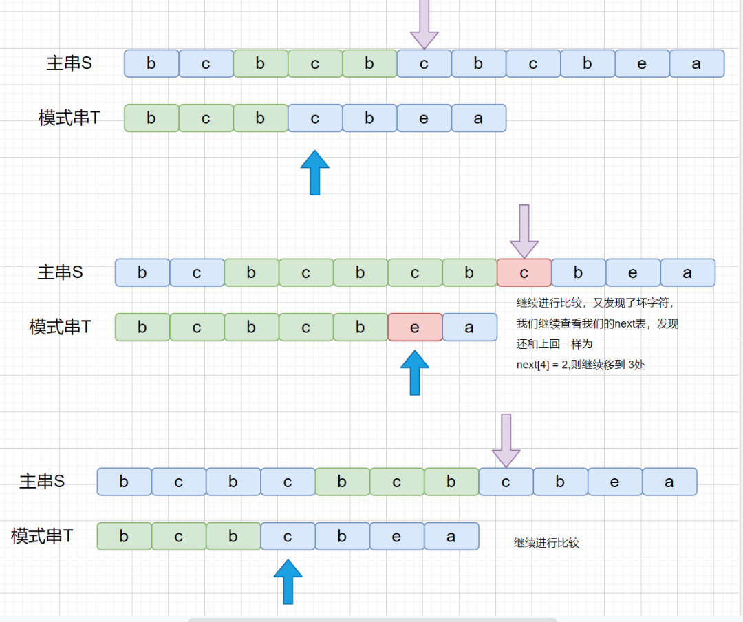 注:为了让读者更容易理解,我们将指针移动改成了模式串移动,两者相对与主串的移动是一致的,重新比较时都是从指针位置继续比较。