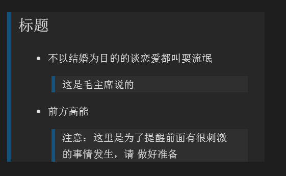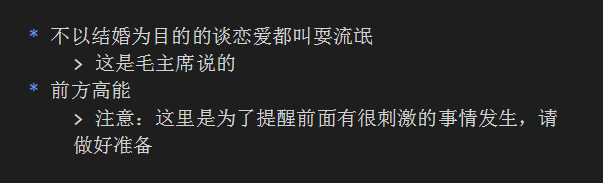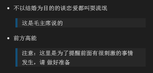 无序列表下方的便是引用,可以有多种用途,看你的需求了,用法就是在语句前面加一个 > ,注意是英文的那个右尖括号,注意空格