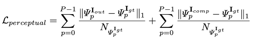 感知损失由Gatys等人提出。[2] 简而言之,我们希望填充图像和背景真实图像具有类似的特征表示,这些特征表示是由像VGG-16这样的预训练网络计算得出的。具体来说,我们将地面真实图像和填充图像输入到经过预先训练的VGG-16中以提取特征。然后,我们计算它们在所有或几层的特征值之间的L1距离。